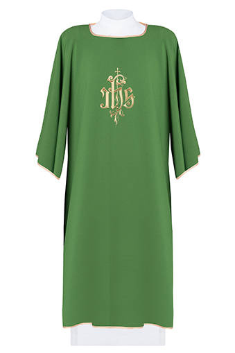Dalmatyka wykonana z gładkiej tkaniny, zdobiona haftem w kolorze złotym.