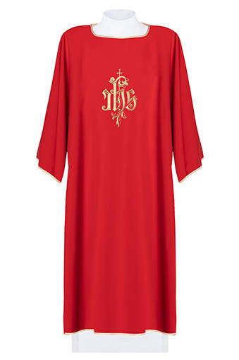 • Dalmatyka wykonana z gładkiej tkaniny, zdobiona haftem w kolorze złotym.
