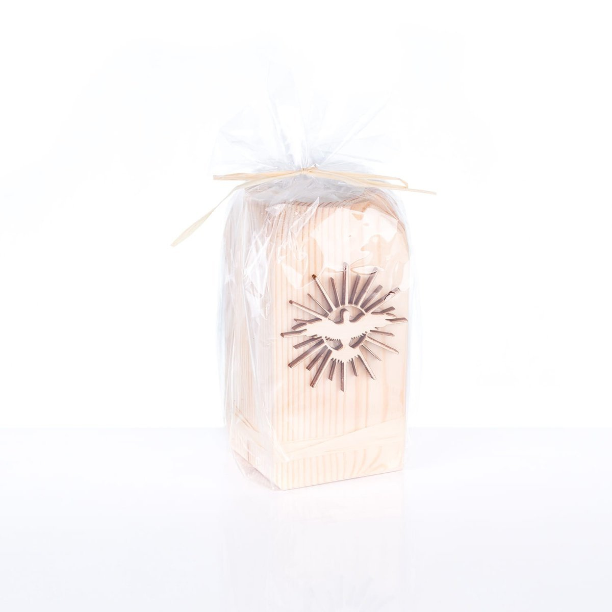 Drewniany świecznik na tealight'a z symbolem Ducha Świętego.