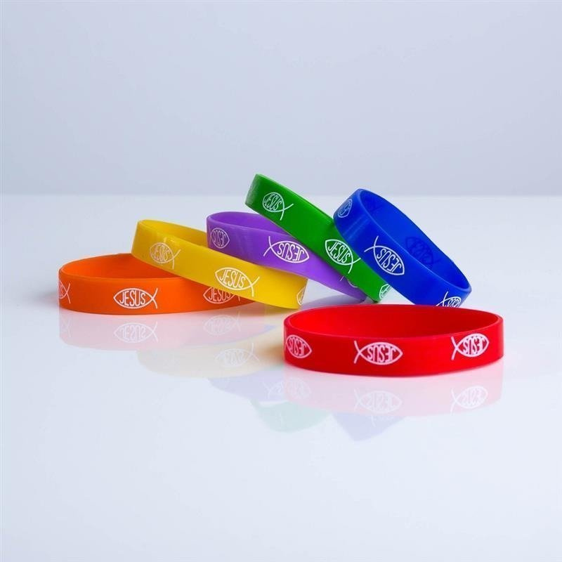 Bransoletka PVC. Z symbolem rybki oraz napisem JESUS. Dostępna w różnych kolorach.