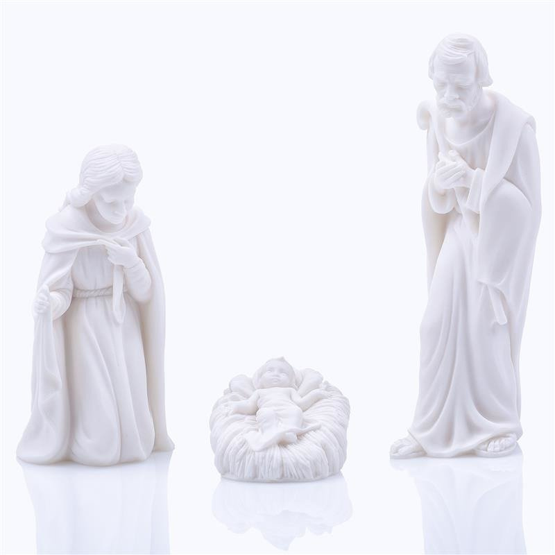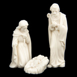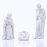 Szopka wykonana z tworzywa alabastrowego. Zestaw zawiera Józefa, Maryję oraz dzieciątko Jezus.