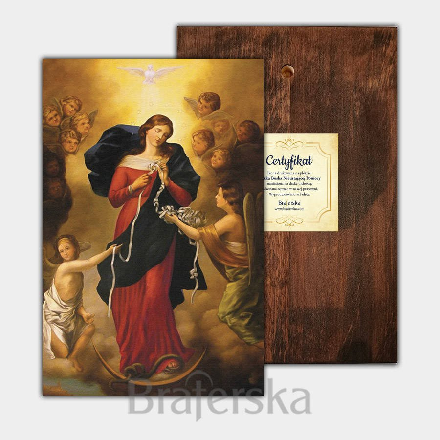 • Ikona drukowana na płótnie Matka Boska rozwiązująca węzły to doskonały pomysł na prezent dla wspólnoty lub bliskiej osoby na uroczystość religijną. Wydruk nałożono na wysokiej jakości deskę olchową.