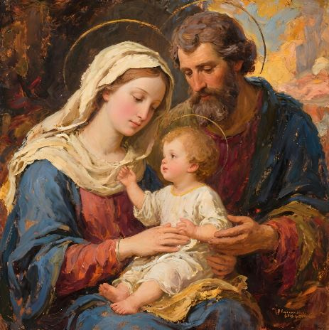 • Motyw: Ukazuje Maryję i Józefa w geście pełnym czułości i troski, otaczających Dzieciątko Jezus. Skupienie postaci i delikatne aureole podkreślają ich świętość i rolę jako wzoru dla wszystkich rodzin.