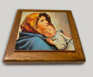 Płytka ceramiczna w drewnianej ramce o wymiarach 13 x 13 cm, w pudełku kartonowym z okienkiem.