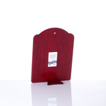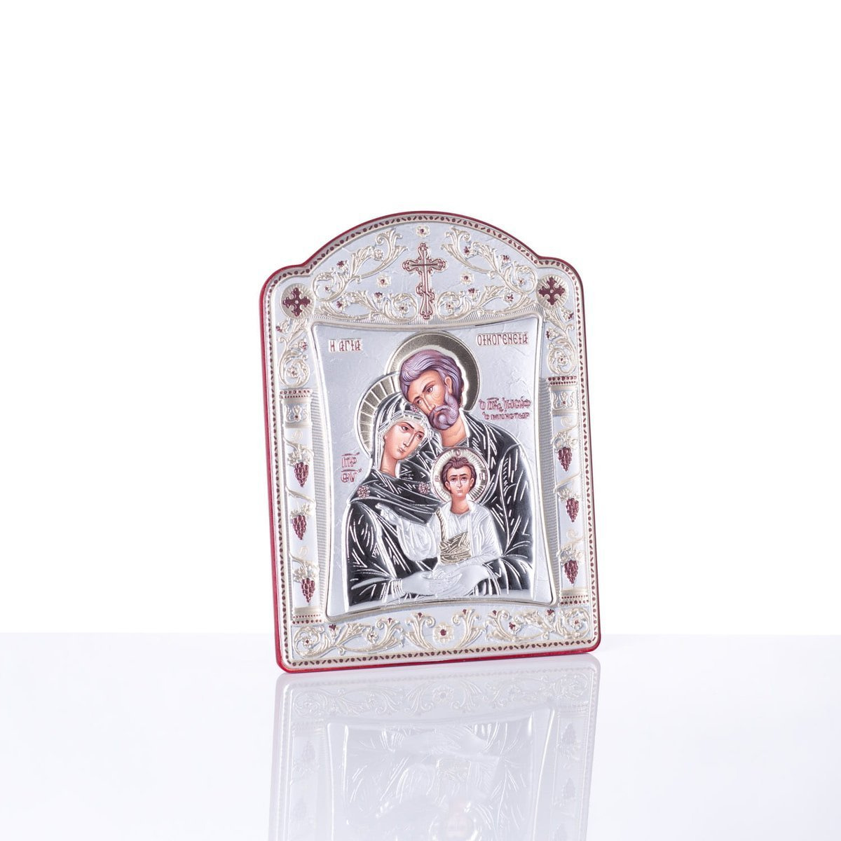 Ikona Świętej Rodziny z ozdobną ramką. Wizerunek w kolorze bordowo-granatowym. Przednia część aluminiowa, tył drewniany. Możliwość powieszenia lub postawienia.