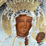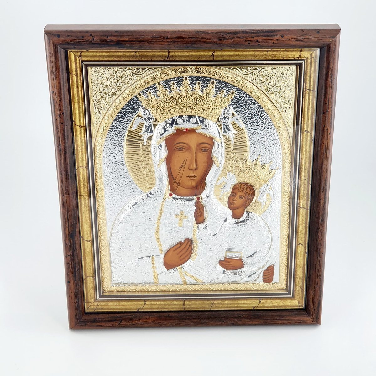 Replika wizerunku Matki Bożej Częstochowskiej w ,,srebrnej sukience". Pięknie wykonany obraz za szkłem, w ramce brązowo-złotej.