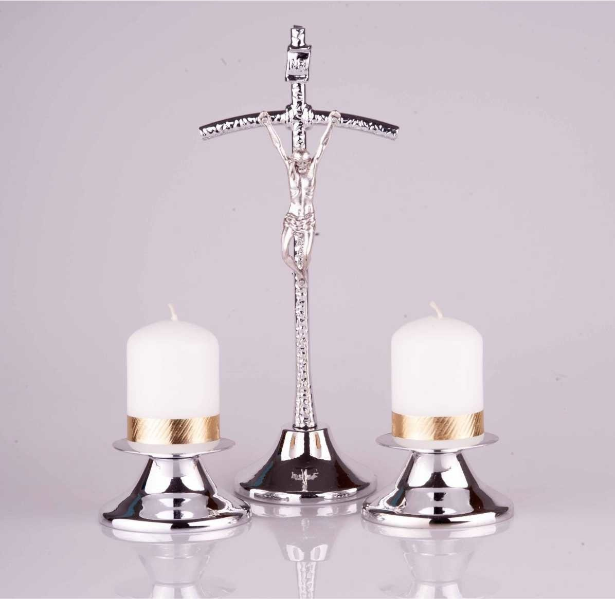 • W zestawie krzyż stojący i 2 lichtarze ze świecami.