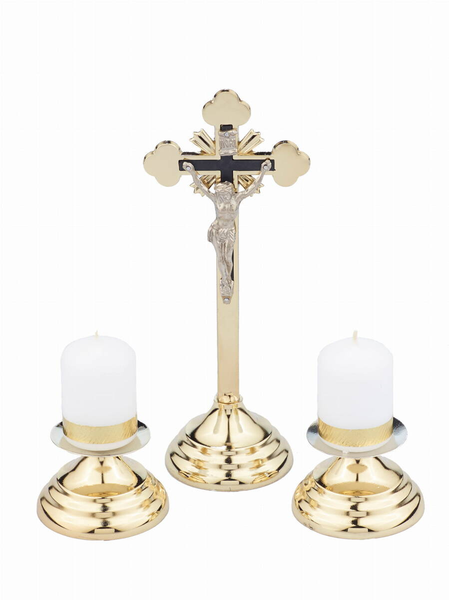 • W zestawie krzyż stojący i 2 lichtarze ze świecami.
