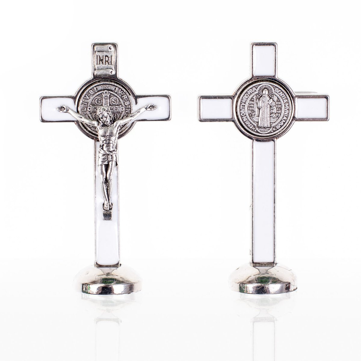 Krzyż św. Benedykta stojący z taśmą samoprzylepną pod podstawą.