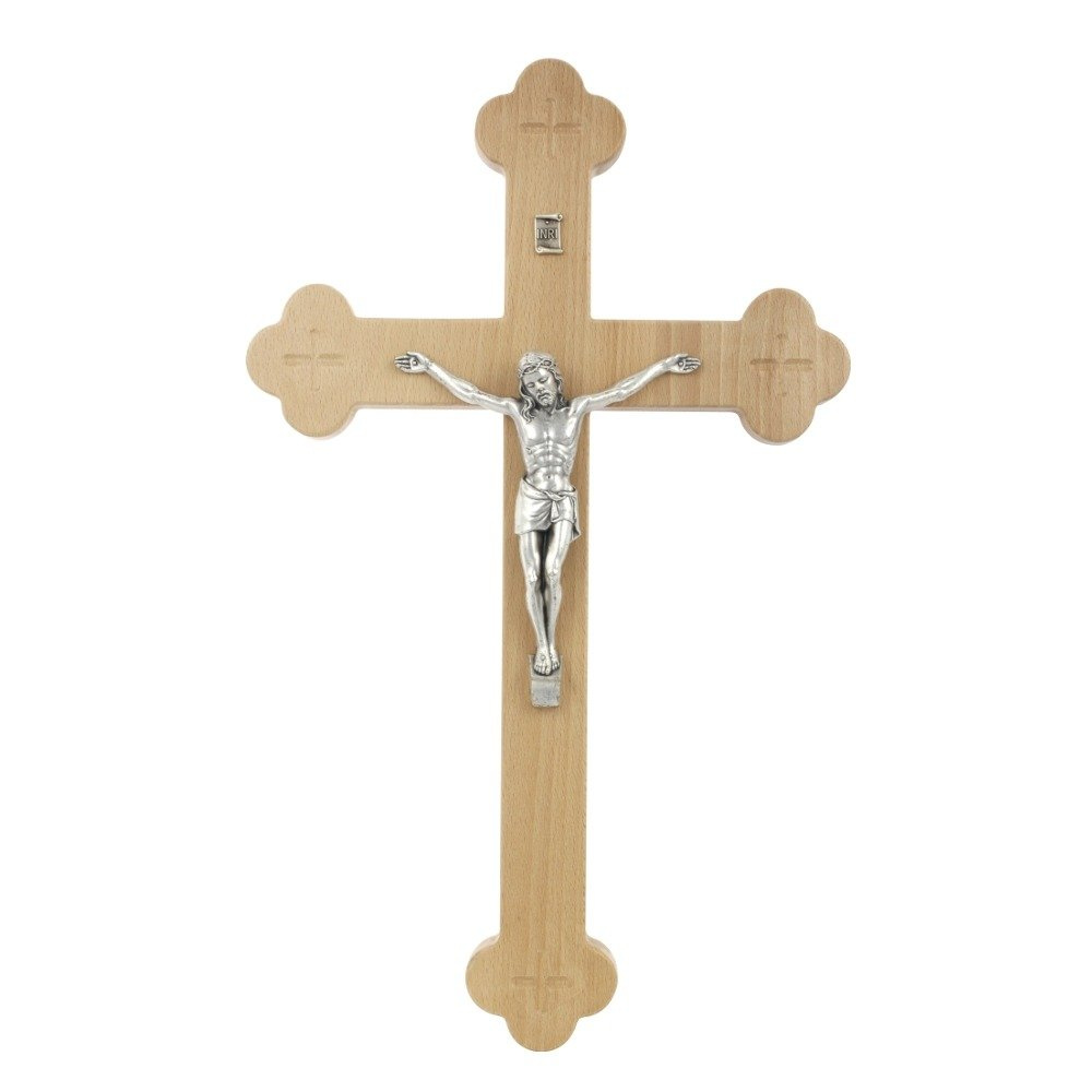 Jest to drewniany krzyż wiszący na ścianę. Krzyż wykonany z litego drzewa. Przyjemny w dotyku dzięki gładkim zaokrąglonym krawędziom. Powierzchnia zabezpieczona bezbarwnym lakierem. Dodatkowo w tylnej części krzyża znajduje się otwór umożliwiający zawieszanie. Posiada wysokiej jakości metalowy korpus Jezusa.