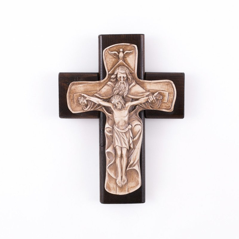 Drewniany krzyż przedstawiający Trójcę Świętą - Ojca, Syna i Ducha.