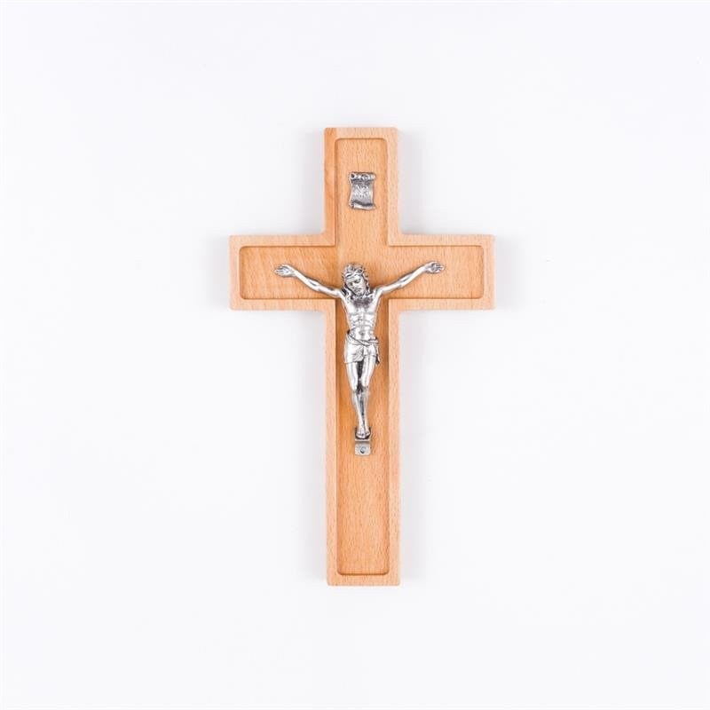 Krzyż wykonany z jednego fragmentu drewna bukowego. Przyjemny w dotyku dzięki gładkim krawędziom. Powierzchnia zabezpieczona bezbarwnym lakierem. Krzyż klasyczny, z jasną obwódką i środkiem wypełnionym ciemno brązowym drewnem. Dodatkowo w tylnej części krzyża znajduje się otwór umożliwiający zawieszanie. Posiada wysokiej jakości metalowy korpus Jezusa.