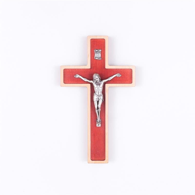 Krzyż wykonany z jednego fragmentu drewna bukowego. Przyjemny w dotyku dzięki gładkim krawędziom. Powierzchnia zabezpieczona bezbarwnym lakierem. Krzyż klasyczny, z jasną obwódką i środkiem wypełnionym ciemno brązowym drewnem. Dodatkowo w tylnej części krzyża znajduje się otwór umożliwiający zawieszanie. Posiada wysokiej jakości metalowy korpus Jezusa.