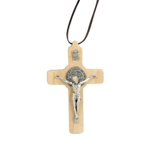 W krzyżu znajduje się po obu stronach medalik św. Benedykta patrona egzorcystów, patrona europy i patrona dobrej śmierci. Wielkiego świętego. Krzyż wykonany z litego drzewa (krzyż nie jest klejony, jest z jednego kawałka drzewa).