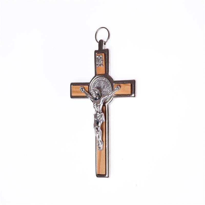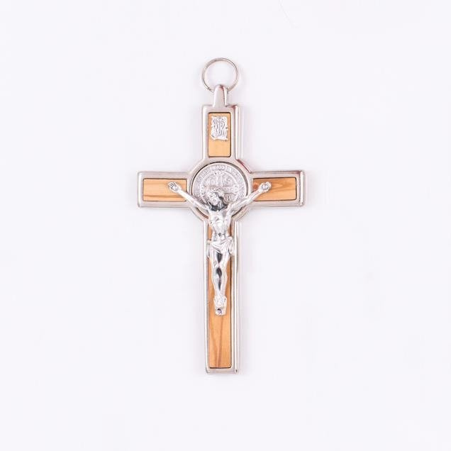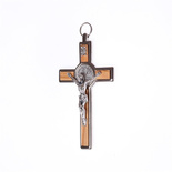 • Krzyżyk w kolorze srebrnym z medalem Św. Benedykta. Wypełnienie krzyża drewniane.