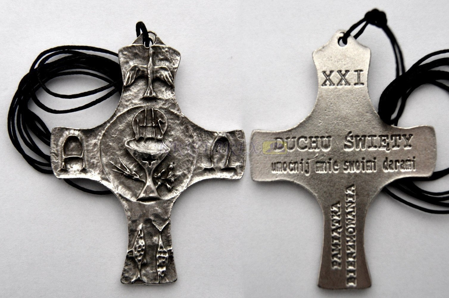 Na odwrocie krzyża wygrawerowany napis : Duchu Święty umocnij mnie swoimi darami, Pamiątka Bierzmowania,