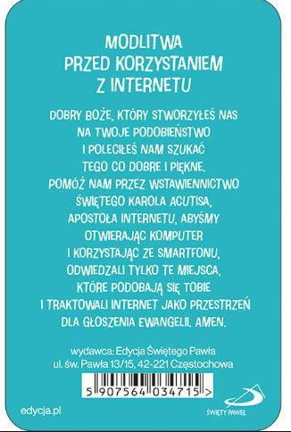 Czy można dobrze przygotować się do korzystania ze smartfonu i komputera? Ta karta z modlitwą będzie doskonałą pomocą! Niewielka i trwała, może być noszona w portfelu, etui na dokumenty czy włożona do Biblii. To doskonały pomocnik zwłaszcza dla młodych chrześcijan.