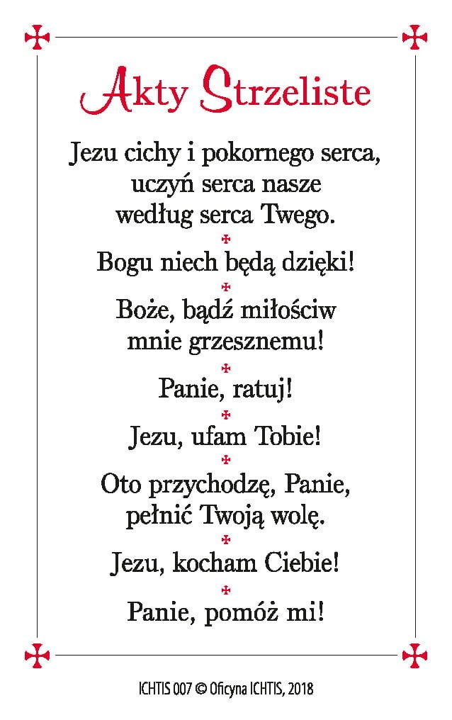 Na pierwszej stronie wizerunek oblicza Jezusa z całunu; na odwrocie akty strzeliste.