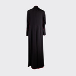 Sutanna wykonana z tropiku w kolorze czarnym z fioletowym obszyciem, podszyta szczotką