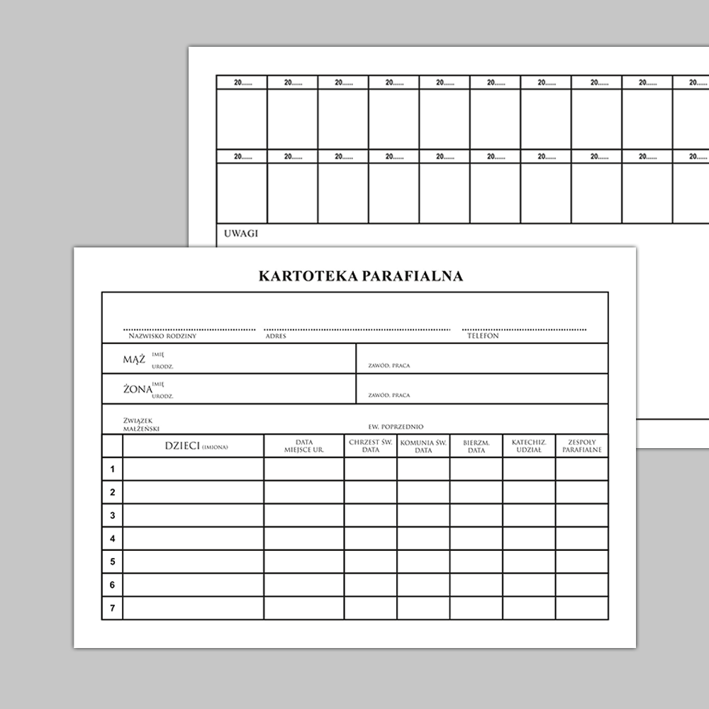 Kartoteka parafialna/ Karty kolędowe to zestaw 100 szt. kart. Karty mają format A5 (148x210 mm) i są wydrukowane na sztywnym papierze, po którym łatwo się pisze.