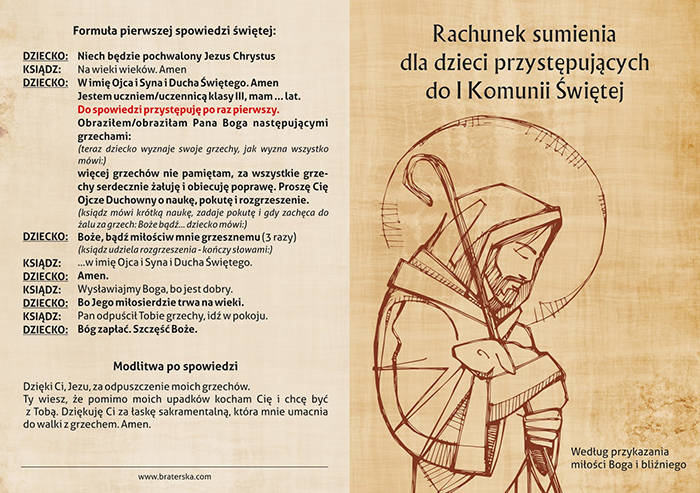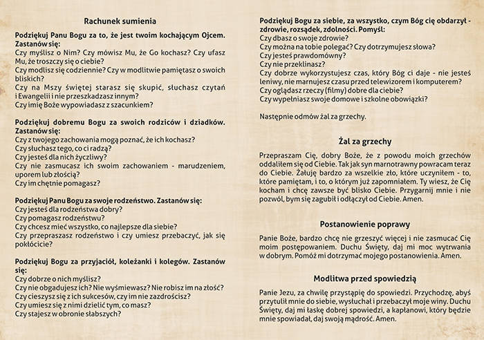 Rachunek sumienia dla dzieci przystępujących do Pierwszej Komunii Świętej to idealna pomoc w przygotowaniu do przeżycia dobrej Spowiedzi Świętej i przyjęcia Pana Jezusa do serca. Rachunek sumienia dla dzieci posiada modlitwę przed spowiedzią, po spowiedzi, formułę Spowiedzi Świętej. Rachunek sumienia ma format A5 składany do A6 i drukowany jest na sztywnym papierze kredowym.