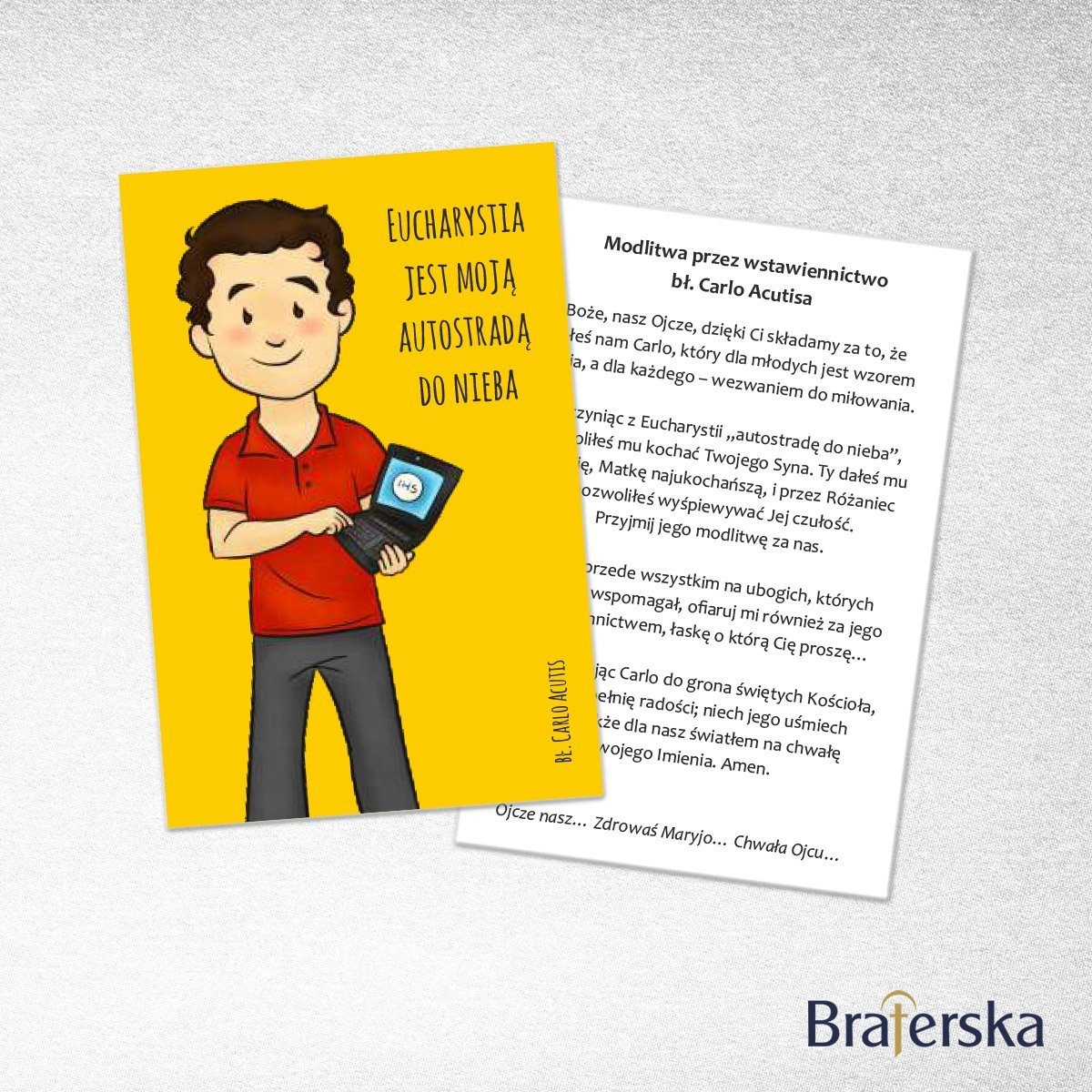 • Dwustronny obrazek dla dzieci św. Carlo Acutis z modlitwą. Komplet zawiera 50 sztuk obrazków o wymiarze 70x105 mm. Papier - kreda 350g, foliowany dwustronnie.