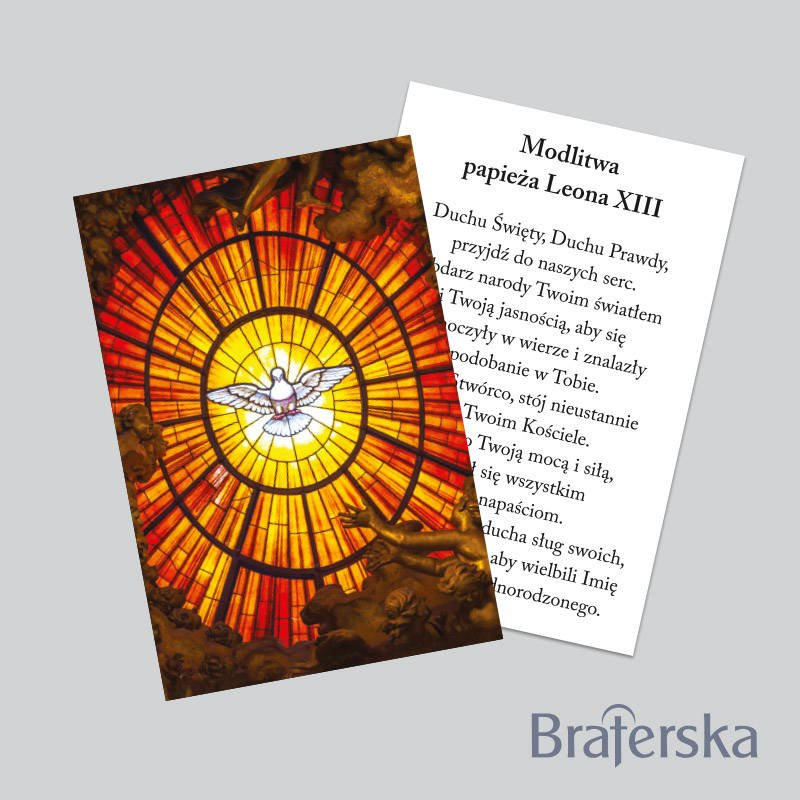 • Dwustronny obrazek Ducha Świętego z modlitwą. Zestaw zawiera 50 sztuk obrazków o wymiarze 70x105 mm. Papier - kreda matowa 350g.