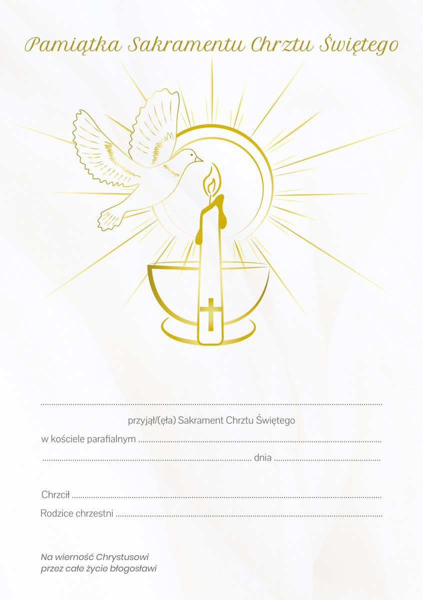 Format A5 Pamiątka drukowana jest na sztywnym papierze. Przeznaczona do samodzielnego wypełniania cienkopisem. Istnieje możliwość zamówienia pamiątek spersonalizowanych z danymi parafii. W tym celu skontaktuj się z naszym sklepem telefonicznie lub mailowo.