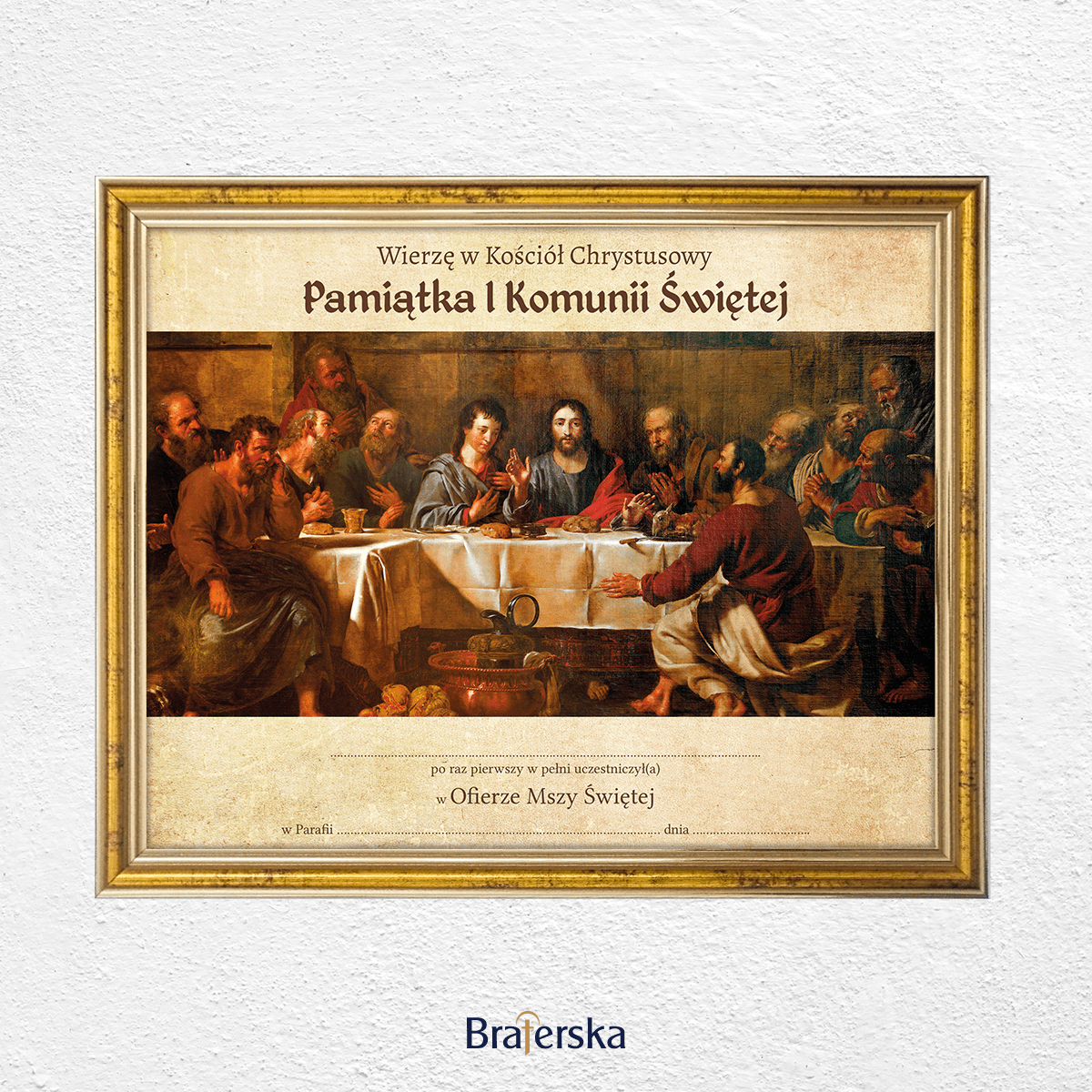 Oferujemy Państwu obrazek Pamiątkę Pierwszej Komunii Świętej w drewnianej ramce w kolorze złotym, gotowa do wypisania. Ramka posiada haczyk do zawieszenia na ścianie. Istnieje możliwość dodania plecków z podstawką, po wcześniejszym ustaleniu mailowym lub telefonicznym.