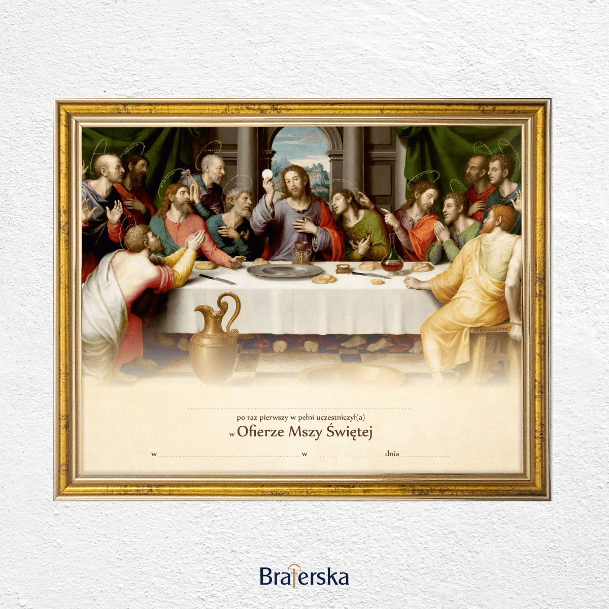 Oferujemy Państwu obrazek Pamiątkę Pierwszej Komunii Świętej w drewnianej ramce w kolorze złotym, gotowa do wypisania. Ramka posiada haczyk do zawieszenia na ścianie. Istnieje możliwość dodania plecków z podstawką, po wcześniejszym ustaleniu mailowym lub telefonicznym.