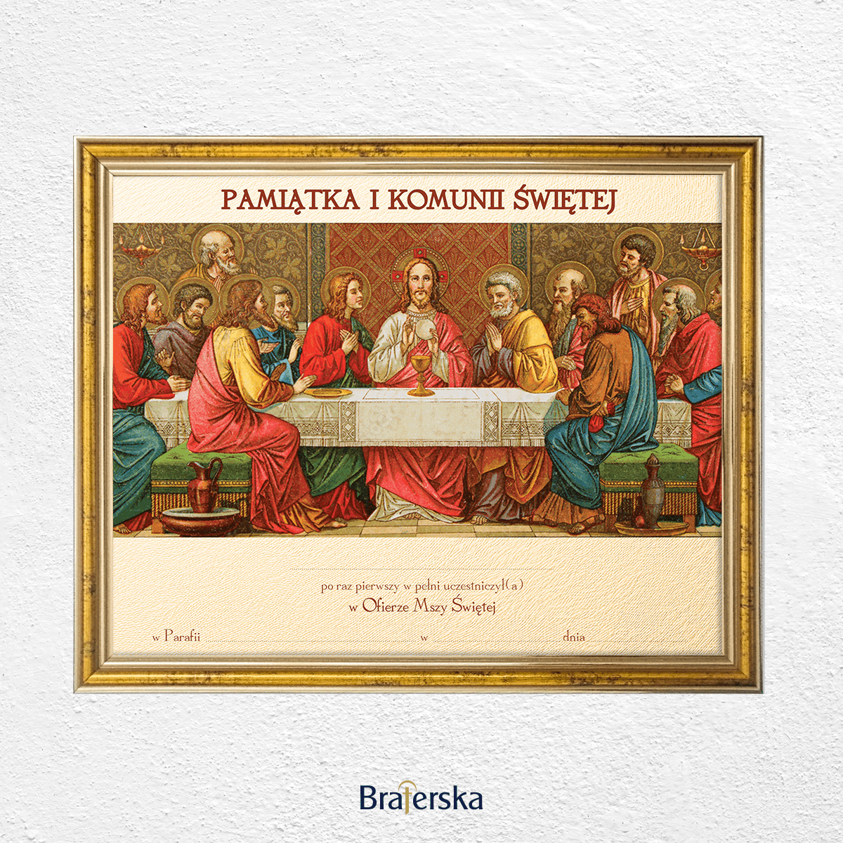 Oferujemy Państwu obrazek Pamiątkę Pierwszej Komunii Świętej w drewnianej ramce w kolorze złotym, gotowa do wypisania. Ramka posiada haczyk do zawieszenia na ścianie. Istnieje możliwość dodania plecków z podstawką, po wcześniejszym ustaleniu mailowym lub telefonicznym.