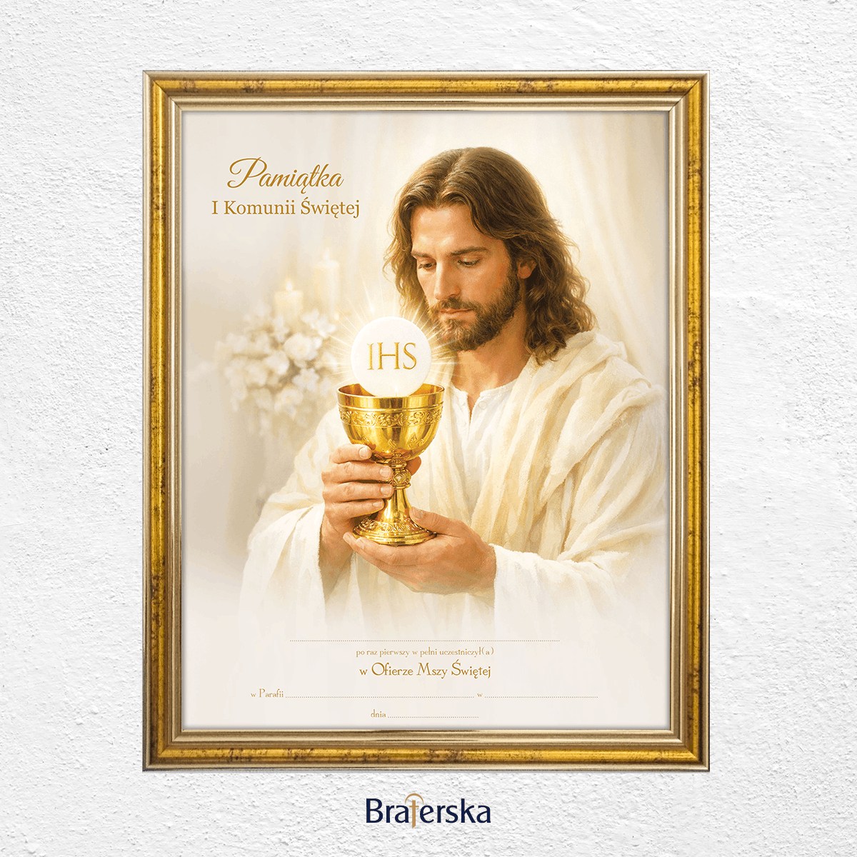 Oferujemy Państwu obrazek Pamiątkę Pierwszej Komunii Świętej w drewnianej ramce w kolorze złotym, gotowa do wypisania. Ramka posiada haczyk do zawieszenia na ścianie. Istnieje możliwość dodania plecków z podstawką, po wcześniejszym ustaleniu mailowym lub telefonicznym.