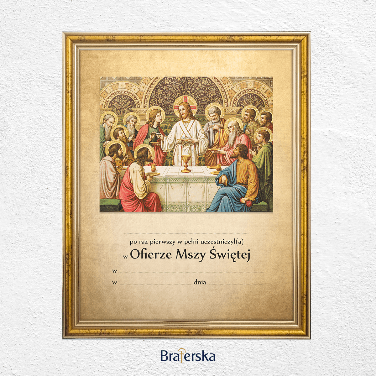 Oferujemy Państwu obrazek Pamiątkę Pierwszej Komunii Świętej w drewnianej ramce w kolorze złotym lub jasny brąz, gotowa do wypisania. Ramka posiada haczyk do zawieszenia na ścianie. Istnieje możliwość dodania plecków z podstawką, po wcześniejszym ustaleniu mailowym lub telefonicznym.