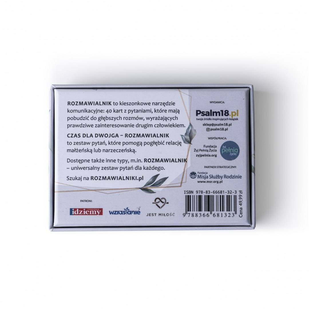 > Jesteś żoną/mężem? Wyobraź sobie miłą randkę, na którą do kieszeni zabierzecie „Czas dla Dwojga - Rozmawialnik", by ten cenny czas sam-na-sam spędzić nie na omawianiu spraw bieżących, ale na głębokich rozmowach i jeszcze lepiej zrozumieć współmałżonka.