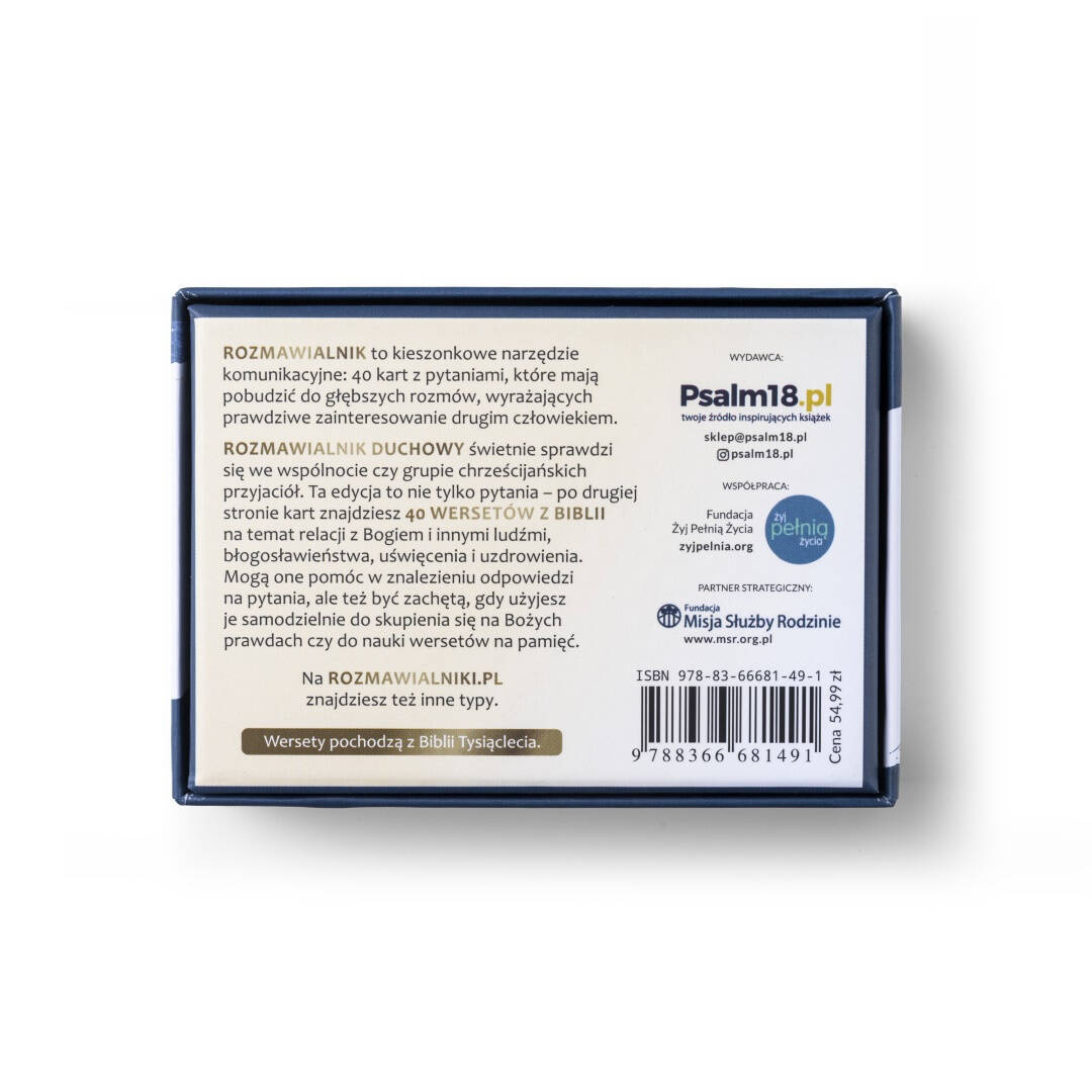 ROZMAWIALNIK DUCHOWY świetnie sprawdzi się we wspólnocie czy grupie chrześcijańskich przyjaciół. Ta edycja to nie tylko pytania – po drugiej stronie kart znajdziesz 40 WERSETÓW Z BIBLII na temat relacji z Bogiem i innymi ludźmi, błogosławieństwa, uświęcenia i uzdrowienia. Mogą one pomóc w znalezieniu odpowiedzi na pytania, ale też być zachętą, gdy użyjesz je samodzielnie do skupienia się na Bożych prawdach czy do nauki wersetów na pamięć.