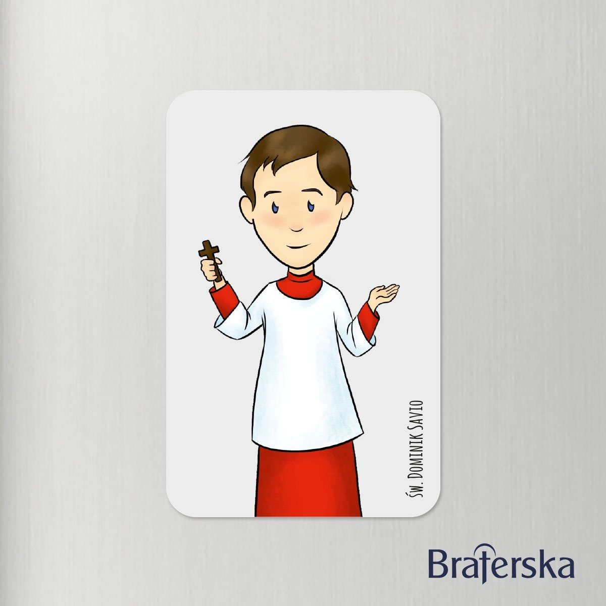 Kolorowy magnes z wizerunkiem św. Dominika Savio w komży to inspirujący sposób na wprowadzenie dzieci w świat świętych patronów. Ciepły, pełen radości design sprawia, że jest to doskonała okazja, by przybliżyć maluchom postacie chrześcijańskie i ich wartości.