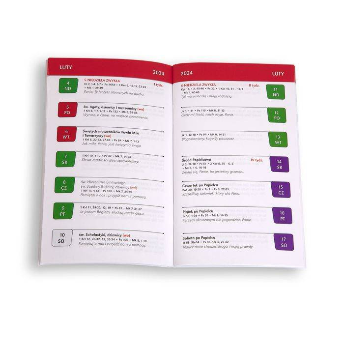 Dodatkowy atut kalendarza to jego niewielkie wymiary, dzięki którym możesz go zabrać wszędzie, gdzie potrzebujesz lub nosić go zawsze przy Piśmie Świętym.