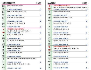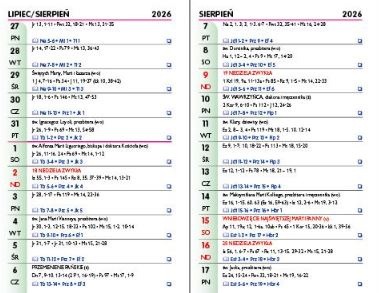 Dodatkowy atut kalendarza to jego niewielkie wymiary 7,50 x 11,50 cm , dzięki którym można włożyć go do Pisma Świętego, aby rozważać Słowo Boże wraz z całym Kościołem.