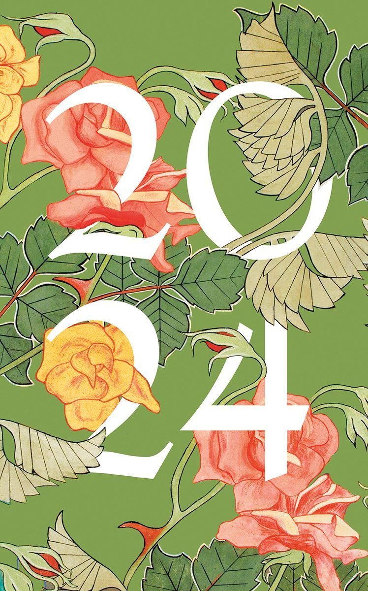 Książkowy kalendarz na rok 2024 z motywem róż Stanisława Wyspiańskiego na okładce, zaprojektowany przez Aleksandrę Samołyk.