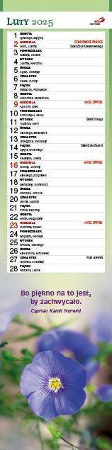 Szukasz kalendarza na ścianę, który nie zajmie wiele miejsca? Kalendarz “Kwiaty” będzie doskonałym wyborem! Oryginalny i praktyczny format zmieści się nawet na niewielkiej przestrzeni, a zachwycające zdjęcia kwiatów dadzą wytchnienie w trudnych chwilach. To praktyczny pomocnik, pozwalający dobrze zaplanować czas, a także zyskać poczucie ładu, harmonii i kontroli.