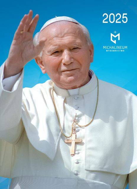Kalendarz ścienny na rok 2025 z fotografiami Jana Pawła II, pochodzącymi z watykańskiego zbioru Vatican Media. Duża przejrzystość każdego miesiąca, z codziennym wykazem imienin.
