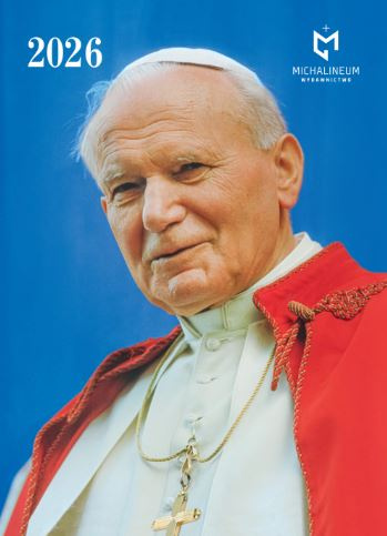 Kalendarz ścienny na rok 2026 z fotografiami Jana Pawła II, pochodzącymi z watykańskiego zbioru Vatican Media. Duża przejrzystość każdego miesiąca, z codziennym wykazem imienin.