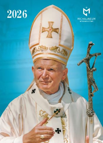 Kalendarz ścienny na rok 2026 z fotografiami Jana Pawła II, pochodzącymi z watykańskiego zbioru Vatican Media. Duża przejrzystość każdego miesiąca, z codziennym wykazem imienin.