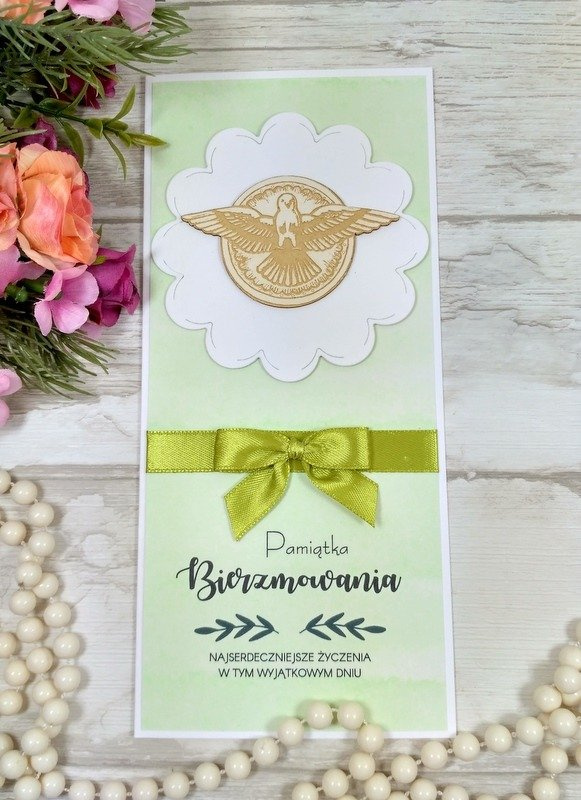 Ręcznie wykonana kartka na bierzmowanie z tekturową gołębicą.