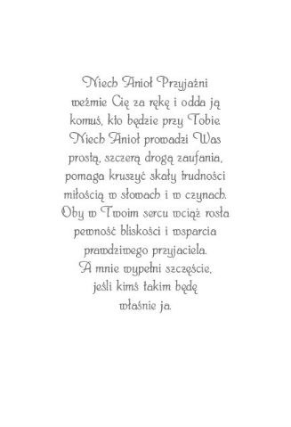 Wewnątrz karnetu zamieszczono piękne życzenia i prośby o wsparcie do wybranego anioła. To słowa, które będą dla obdarowanej osoby jak błogosławieństwo, którym chcesz ją umocnić. Wystarczy tylko podpisać się, choć możesz także dodać słowo od siebie.