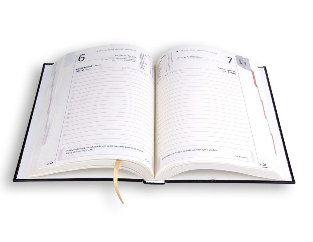 Terminarz MADRID stworzono w praktycznym formacie A5, dzięki któremu możesz mieć go zawsze przy sobie, by towarzyszył planom, spotkaniom, wydarzeniom w ciągu całego roku i przypominał o uroczystościach. Każdy dzień zamieszczono na oddzielnej stronie. Zakładka tasiemkowa oraz perforowane narożniki kartek pomogą Ci sprawnie poruszać się po zapisanych notatkach i ważnych terminach.