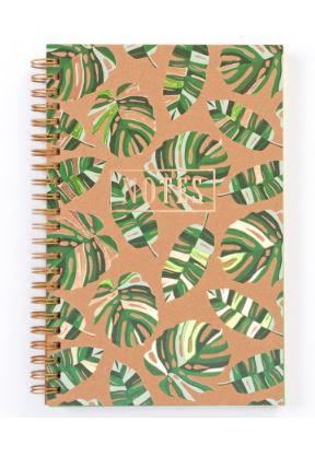 Bogato zdobiony notes na spirali z tłoczoną okładką. Ilustracja okładkowa inspirowana monsterą dziurawą. Ekologiczny notatnik wykonany z tektury w 100% z odzysku. Notes w linie, oprawiony złotą spiralą. Wykończony zieloną wyklejką.