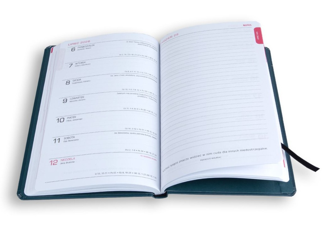 Kalendarz PLANER to połączenie funkcjonalności, elegancji i estetyki. Pozwoli Ci nie tylko dobrze zaplanować czas, ale też zadbać o swojego ducha dzięki myślom na każdy tydzień i informacjom o liturgii dnia. To doskonały kalendarz dla każdego dobrze zorganizowanego chrześcijanina.