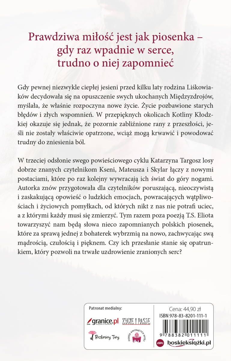 W trzeciej odsłonie swego powieściowego cyklu Katarzyna Targosz losy dobrze znanych czytelnikom Kseni, Mateusza i Skylar łączy z nowymi postaciami, które po raz kolejny wywracają ich świat do góry nogami. Autorka znów przygotowała dla czytelników poruszającą, nieoczywistą i zaskakującą opowieść o ludzkich emocjach, powracających wątpliwościach i życiowych pomyłkach, od których nikt z nas nie potrafi uciec, a z którymi każdy musi się zmierzyć. Tym razem poza poezją T.S. Eliota towarzyszyć nam będą słowa nieco zapomnianych polskich piosenek, które za sprawą jednej z bohaterek wybrzmią na nowo, zachwycając swą mądrością, czułością i pięknem. Czy ich przesłanie stanie się opatrunkiem, który pozwoli na trwałe uzdrowienie zranionych serc?