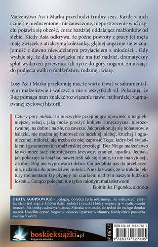 Cztery pory miłości to niezwykle przejmująca opowieść o najpiękniejszej relacji, jaką może przeżyć kobieta i mężczyzna: nierozerwalnej, na dobre i na złe, na zawsze. Jak przekonują się bohaterowie książki, nie można jej budować na ludzkiej, słabej, kruchej i ograniczonej, miłości, ale trzeba do niej zaprosić Tego, który był świadkiem i gwarantem ich małżeńskiej przysięgi. Bez Niego małżeństwo łatwo może stać się miejscem krzywdy, zranień, upadku. Jednak, jak pokazuje ta książka, nawet jeśli tak się stanie, to nie ma sytuacji z której Bóg nie wyprowadzi dobra. On uzdalnia nas do przebaczenia, uzdalnia do prawdziwej miłości. Nie ukrywam, że w trakcie lektury momentami łzy płynęły mi ciurkiem nad tym naszym ludzkim losem... Gorąco polecam nie tylko młodym małżeństwom!